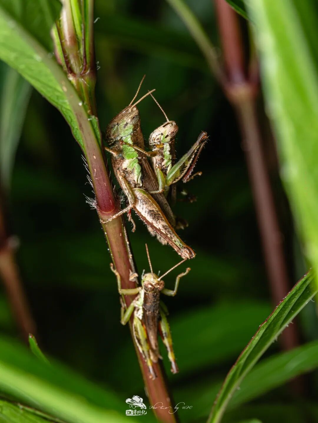图中聚在一起的物种被称为台湾稻蝗,也常被称为草蜢仔。通过图片,可以清晰地看见稻蝗“铠甲”般外壳上的细微绒毛。