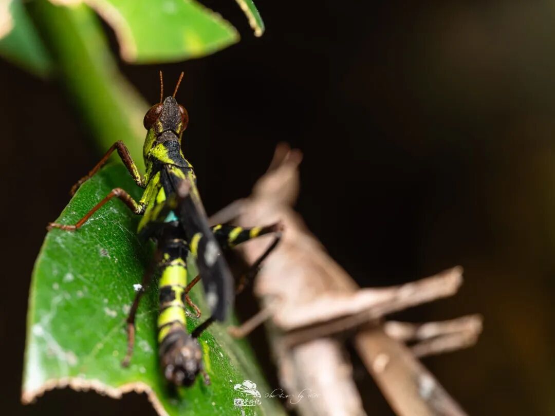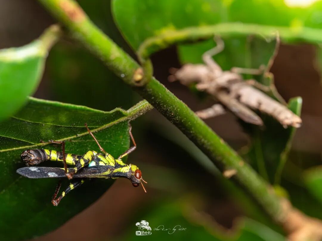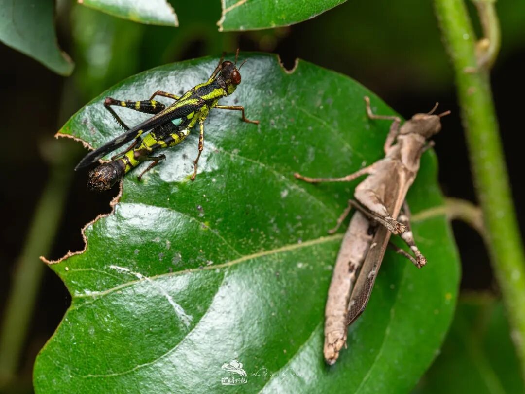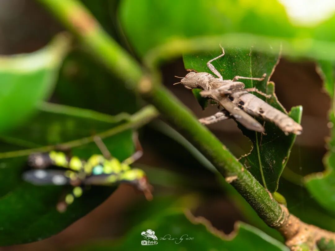 乌蜢的求偶小剧场。颜色呈现鲜艳翠绿色的是雄性乌蜢,但雌性甩开它跑到了另一边的叶子上。除了前面几张相片,这一组相片也能看出,这支镜头无论焦前还是焦后,过渡都相当柔美顺滑,焦外表现优秀。