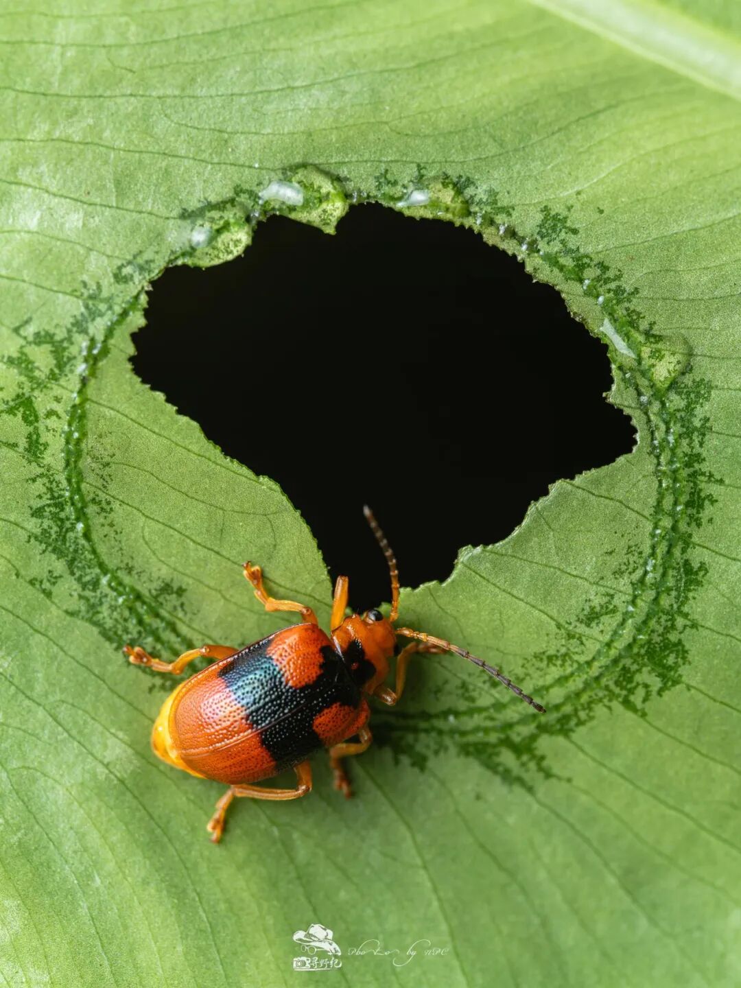 锚阿波萤叶甲,一种以有毒的海芋为食的非常奇特的叶甲。它们会在海芋叶子上画圈,切断其毒素流动,并让部分毒素从叶子伤口中流出,然后啃食圈内叶肉。如果你们见到海芋叶子上有着一个个相当规则的圆洞,那便是它们的杰作。