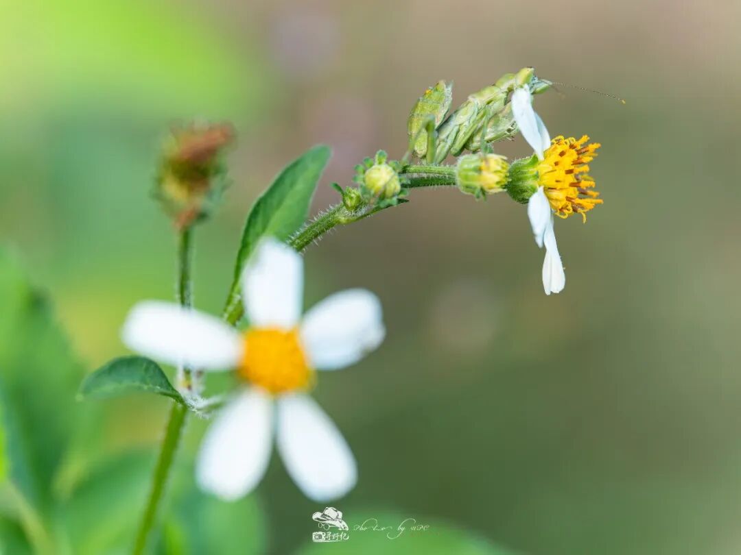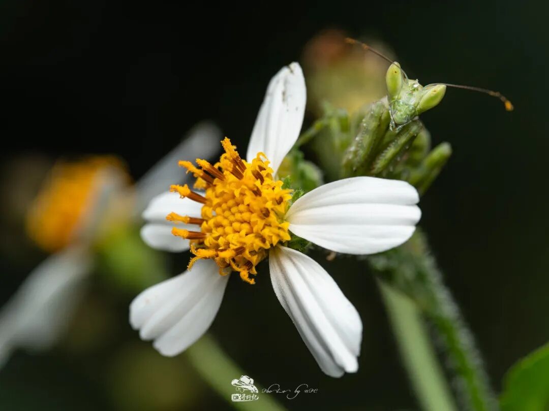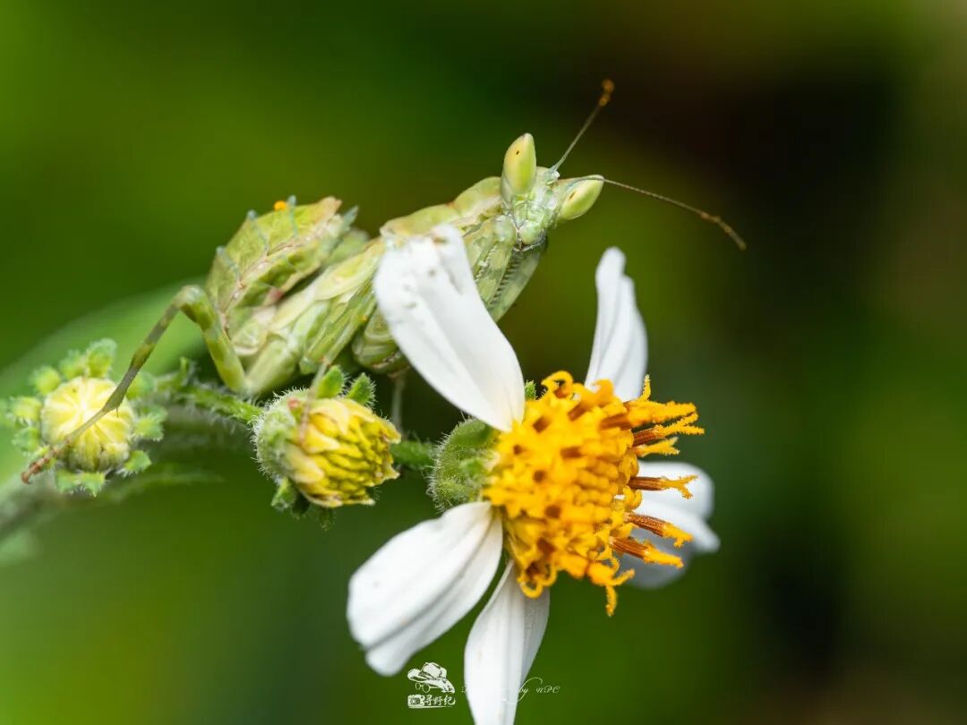 一只在鬼针草花朵上守候着猎物的眼斑螳亚成体,体色与环境高度相近,仔细观察,其触须与腹部末端还粘着一些花粉。